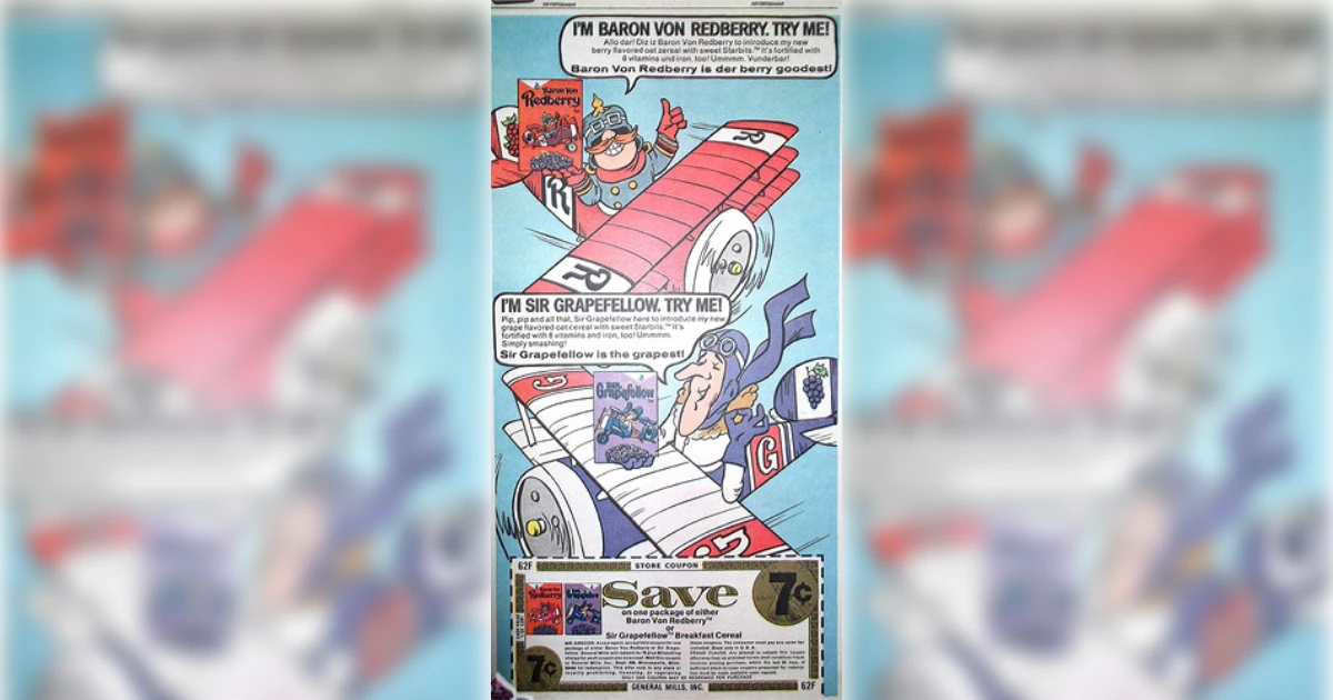 General Mills released this berry-flavored oat cereal in 1972. A World War I German pilot mascot modeled after the Red Baron led the brand. Its star-shaped berry marshmallows tasted like fruit punch. Commercials pitted Baron von Redberry against Sir Grapefellow, with each pilot claiming his cereal was better. But when Monster Cereals outsold it, General Mills discontinued the cereal after three years.