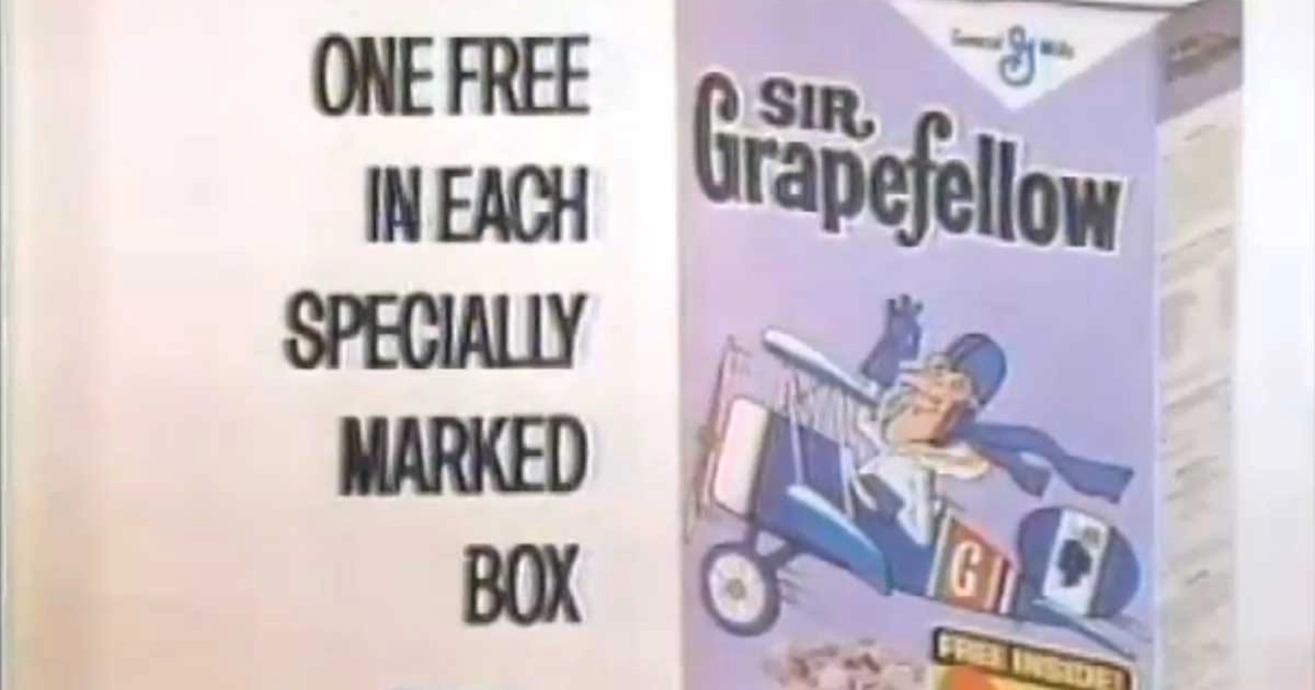 A British World War I pilot mascot flew across boxes of this grape-flavored oat cereal starting in 1972. Star-shaped grape marshmallows filled each box. Opening a box released an intense artificial grape smell. Boxes cost 39 cents and came with balloon-powered air car toys, collectible patches, and mail-away balsa wood gliders. General Mills ended production in 1975 alongside Baron von Redberry.