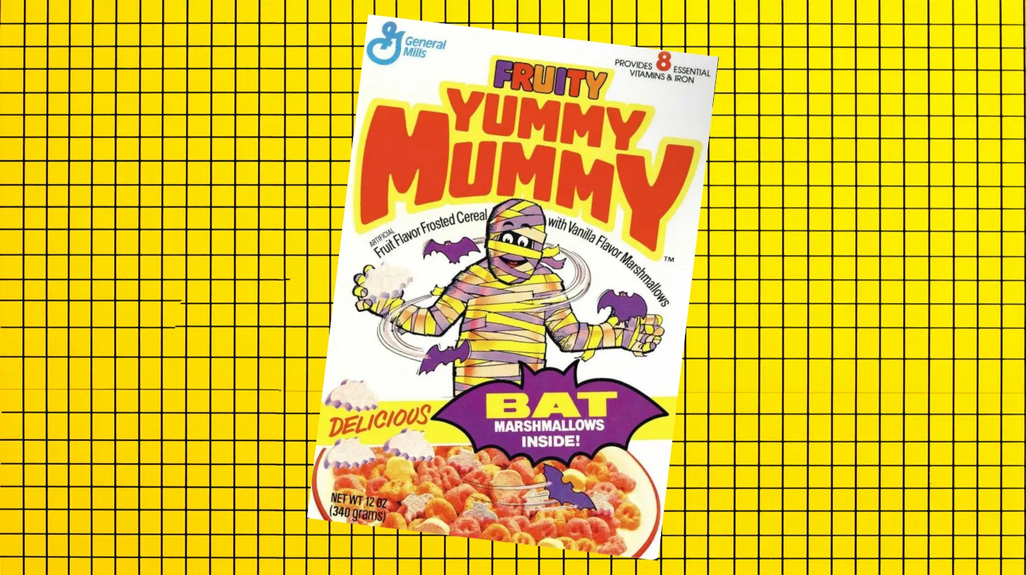 General Mills released this Monster Cereal in 1987 or 1988 (sources differ) to replace Fruit Brute. A mummy wrapped in colorful bandages served as a mascot. The company added "Monster Mallows" (mega-sized marshmallows) across all Monster Cereals at launch. This version lasted four to five years. The 2013 revival used orange cream flavor to separate it from cherry-flavored Frute Brute.