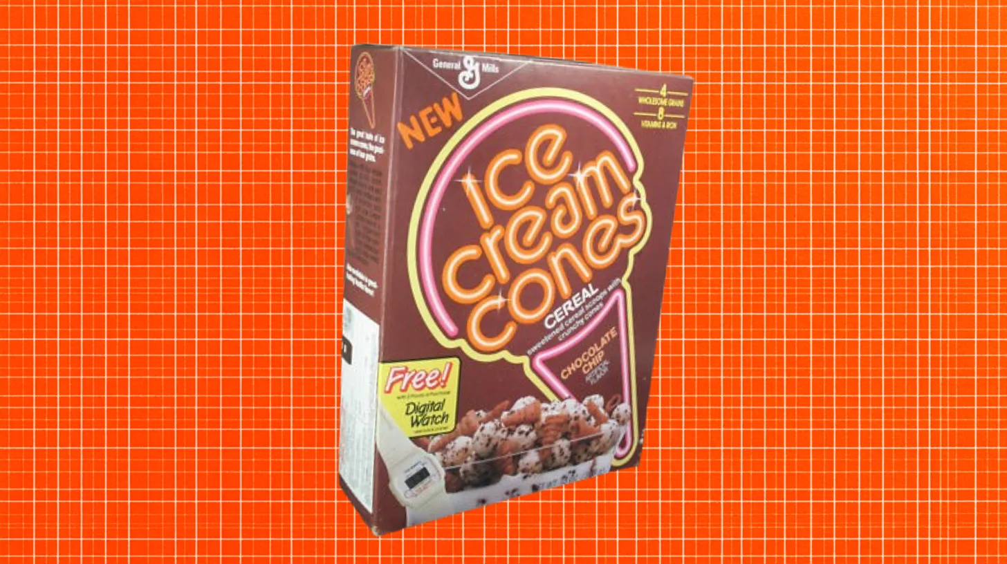 General Mills released this cereal in 1987. Cone-shaped pieces came in vanilla, chocolate, and chocolate chip flavors. A character named Ice Cream Jones and catchy jingles promoted it. Parents complained about health concerns. General Mills pulled it the same year. The 2003 revival celebrated the ice cream cone's centennial. The new version tasted like cookies and cream and included coupons for Nestlé ice cream treats.