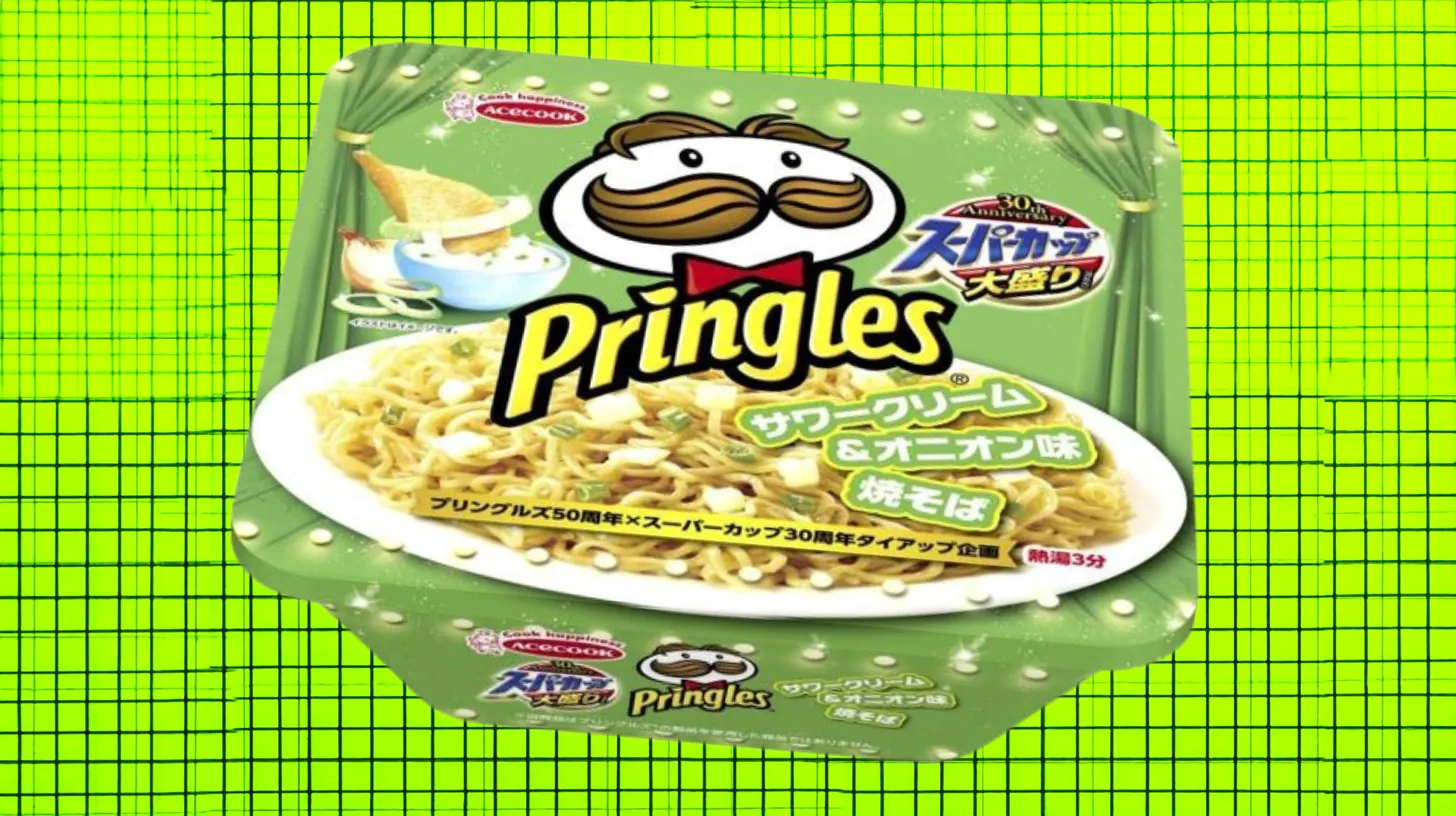 In the late 2010s, Pringles teamed up with Vietnamese producer Acecook to create a ramen that tasted like potato chips. The Sour Cream and Onion variety came in square boxes featuring the Pringles mascot.