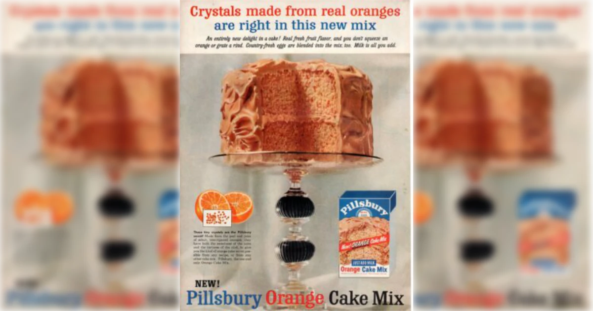 Pillsbury sold this boxed cake mix around 1955. Orange is hard to get right in baked goods. When it fails, it tastes fake. When it works, it makes a good springtime dessert. Little information survives about when or why Pillsbury discontinued it.