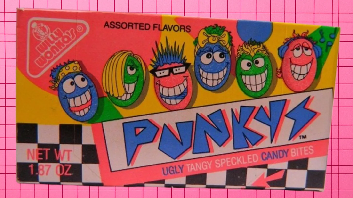 Wonka Punkys emerged in 1987 as the candy company's tribute to punk rock culture. The sour candy featured checkerboard packaging and rebellious branding. The small oval candies featured sugar crystal coatings and delivered both sweet and sour flavors to match their edgy aesthetic. Punkys lasted only two years before Wonka abandoned the punk theme and discontinued the line.