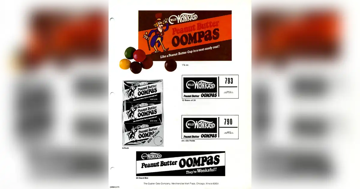 One of the first Wonka products in 1971. Each candy was quarter-sized with a candy shell covering half chocolate, half peanut butter. The split filling let you taste both flavors in one bite. A strawberry version appeared in 1980 but failed. Production ended in 1982. Nestlé brought back the name in 2001 for a different UK candy with flavors like mashed potato and cucumber. Those candies were eventually discontinued as well.