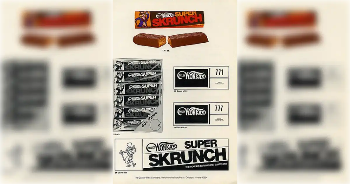 Another early candy bar by Wonka. The Super Skrunch Bar featured peanut butter and was layered with crisp rice chocolate. It was eventually replaced by a similar product called Willy Wonka's Peanut Butter Bar.