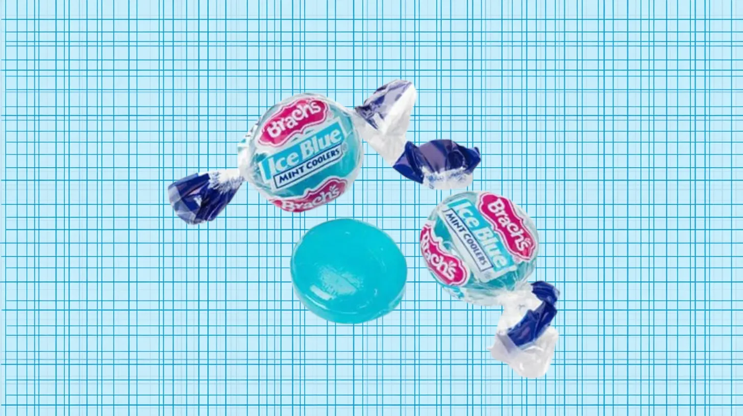 Brach's Ice Blue Mints were individually wrapped translucent blue peppermint hard mints made with real peppermint oil. Released in the mid-20th century, they became "probably the most requested bulk candy of all time." Brach's redesigned them into weaker-flavored "Mint Coolers" before discontinuing the product entirely in the 2010s.